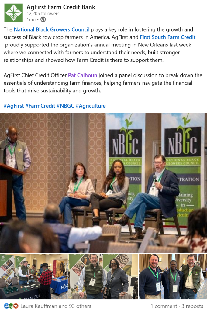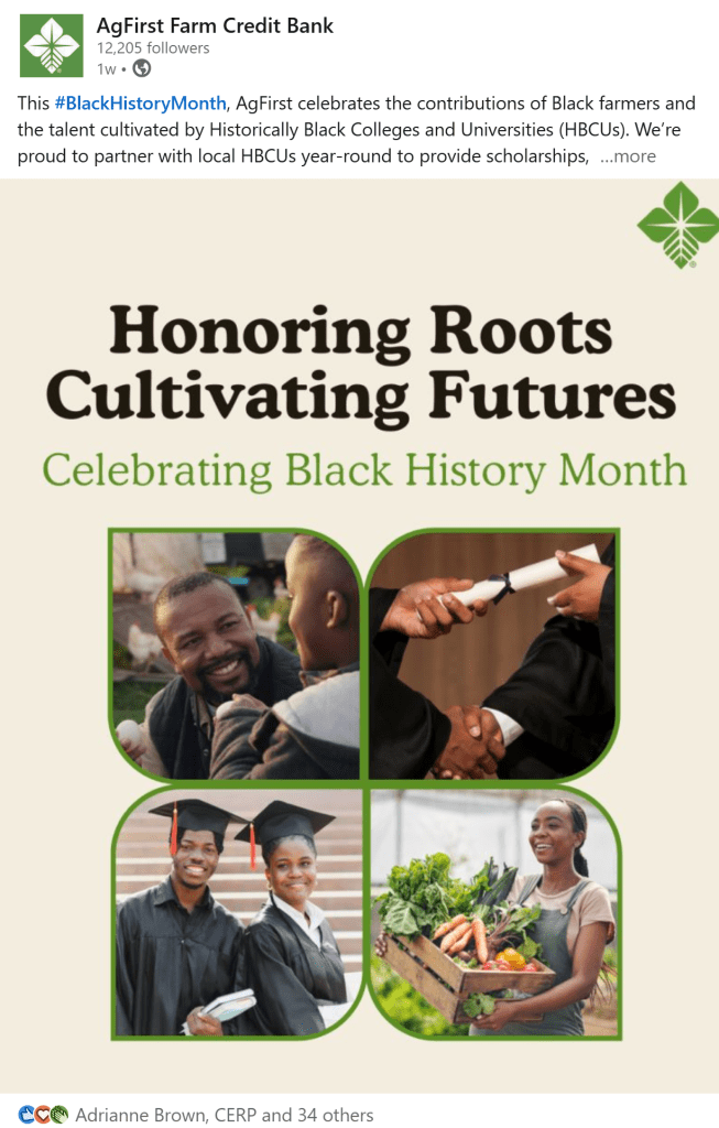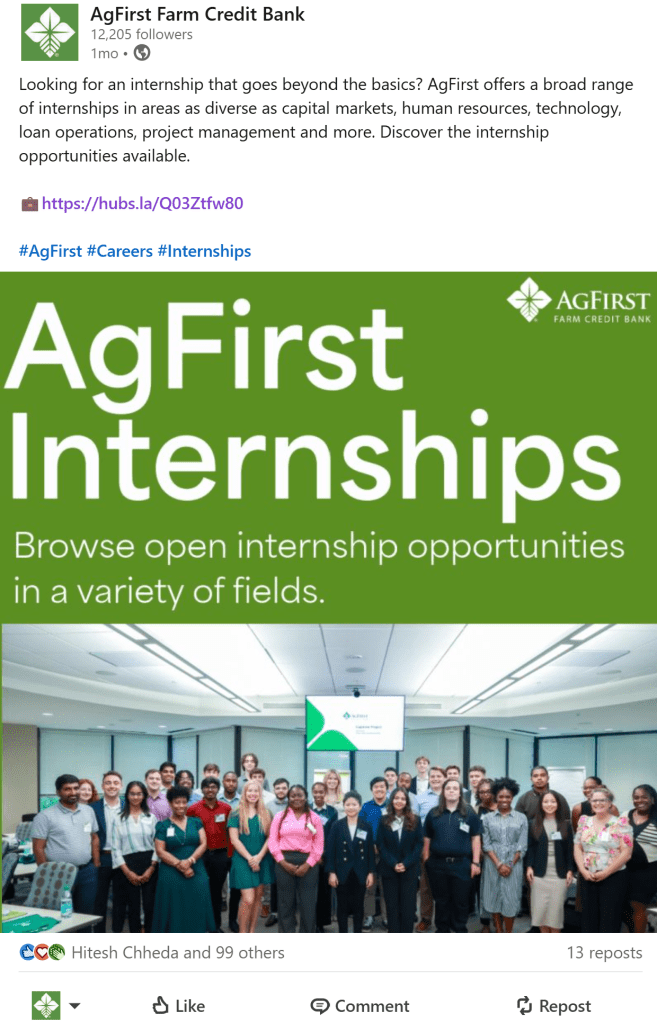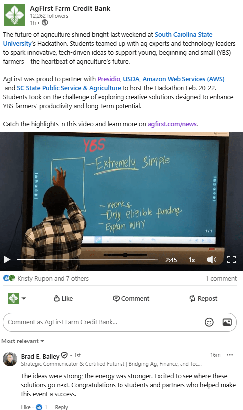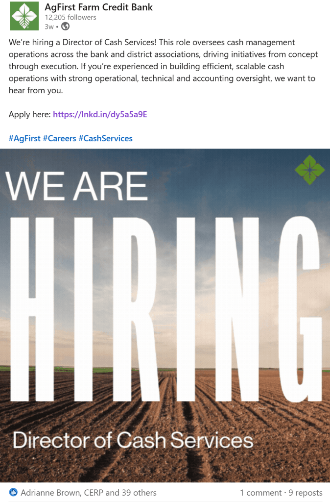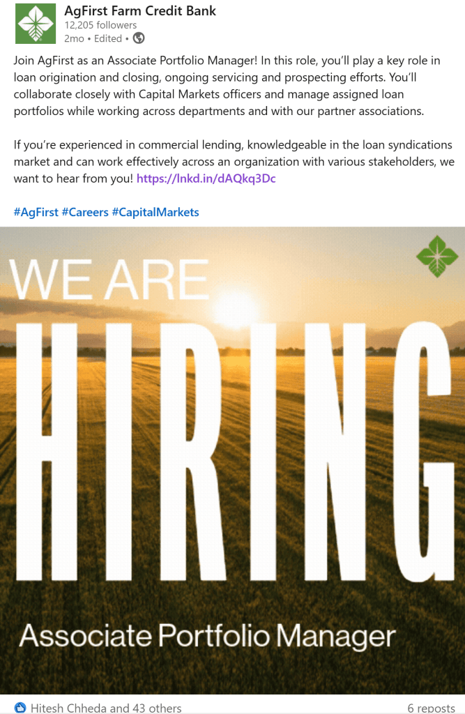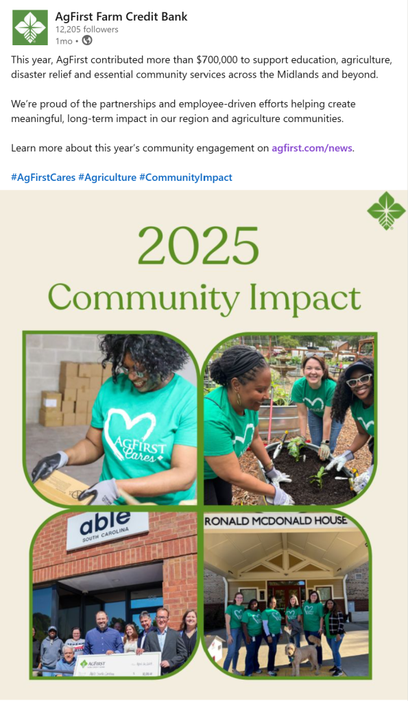 I currently manage AgFirst Farm Credit Bank’s LinkedIn account. I write, design, engage and post all content on the account. Before then, I managed four social media accounts for the USC Alumni Association and oversaw the company’s social media ambassador program. Have experience using HubSpot and Sprout Social for social media management. Below are snapshots of a variety of social media posts.
